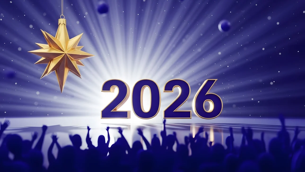 Alt: A golden star ornament hangs above the year 2026, with a crowd of people cheering in a blue-lit celebratory scene.