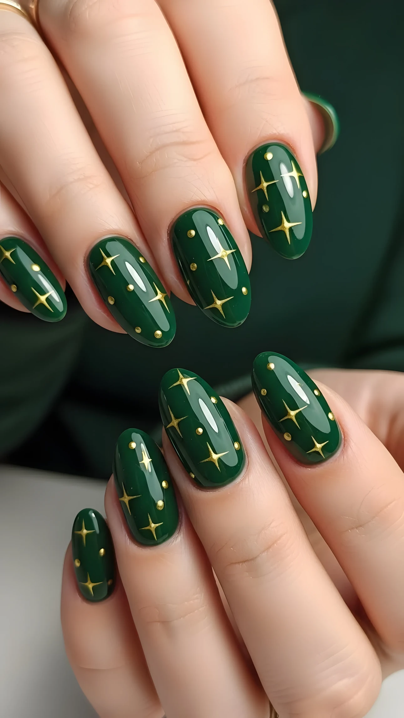 This image showcases a set of perfectly shaped, glossy green nails, each adorned with delicate gold stars and dots. The rich, deep green of the nail polish provides a luxurious backdrop for the shimmering gold accents, creating a sophisticated and festive aesthetic. The studio lighting enhances the glossy finish of the nails, highlighting the intricate details of the nail art. The composition focuses on the hands, drawing the viewer's attention to the flawless manicure and the overall elegance of the design. The harmonious color palette and balanced composition evoke a sense of refined beauty and timeless style. The image captures the essence of high-end nail artistry, making it an ideal visual asset for beauty brands and nail technicians.