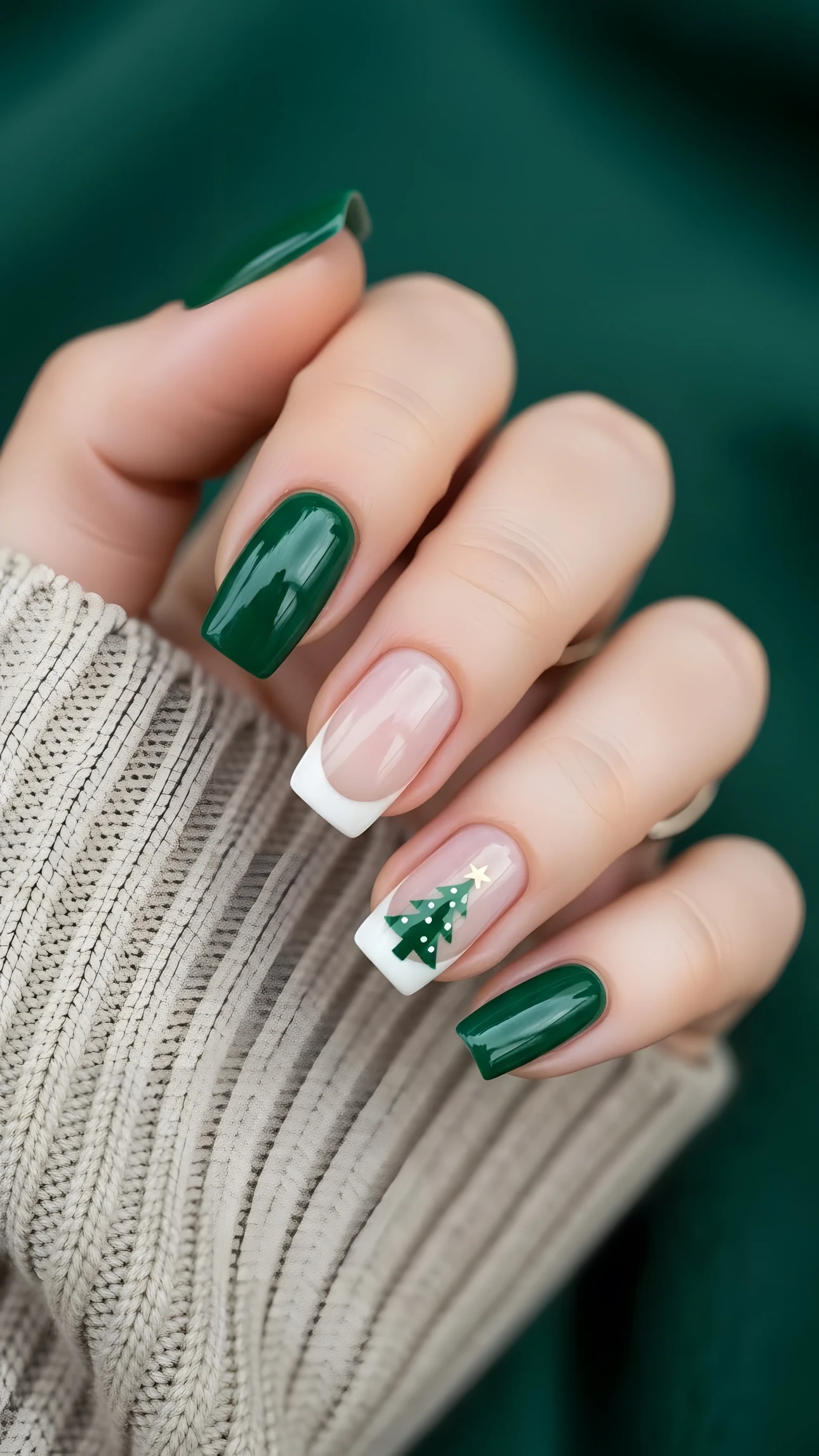 This image showcases a beautifully manicured hand featuring a combination of classic and festive nail designs. The nails are painted in a rich, glossy green, reminiscent of evergreen trees, while one nail features a delicate white tip. The star of the show is the nail art depicting a charming Christmas tree, complete with tiny white ornaments and a golden star on top. The soft, diffused lighting enhances the depth of the colors and the intricate details of the nail art, creating a warm and inviting atmosphere. The hand is gently resting against a backdrop of a cozy, knitted sweater, adding to the overall feeling of comfort and holiday cheer. The harmonious earth tones of the sweater and the vibrant green of the nails create a balanced and visually appealing composition. The image evokes a sense of joy, creativity, and the anticipation of the holiday season.