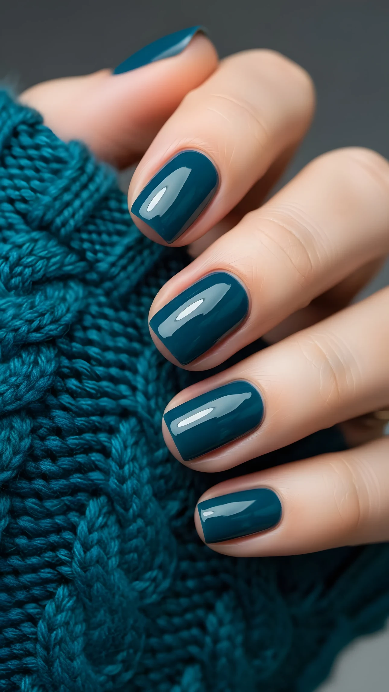 This image features a hand with short, square-shaped nails adorned with a glossy teal nail polish. The deep, rich color of the polish is the focal point, reflecting light to create a captivating shine. The hand rests against a matching teal cable knit sweater, creating a monochromatic aesthetic that is both visually appealing and texturally interesting. The close-up shot highlights the details of both the manicure and the knit pattern, emphasizing the quality and care put into both. The skin tone of the hand is fair, providing a subtle contrast to the bold color of the polish and sweater. The overall composition is clean and modern, making it suitable for a variety of design applications. The lighting is soft and diffused, enhancing the natural beauty of the hand and the textures of the sweater.