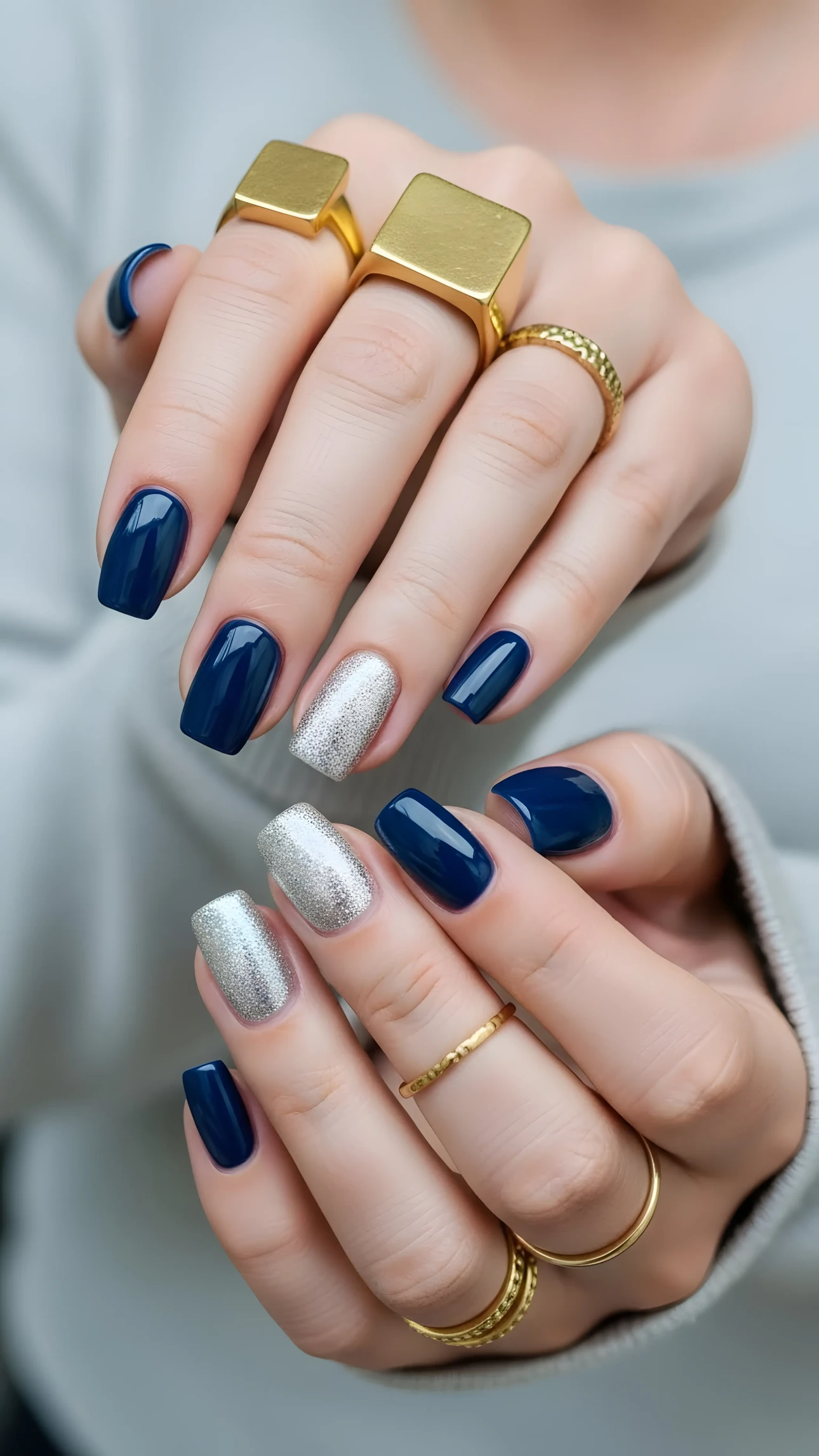 Alt: ernate between a deep, glossy navy blue and a shimmering silver glitter, creating a striking contrast. The navy polish reflects light beautifully, adding depth and richness to the overall look. Complementing the manicure are several exquisite gold rings, including a bold, square statement ring and delicate textured bands. The rings add a touch of luxury and sophistication, enhancing the overall aesthetic. The soft, neutral background of a gray sweater provides a subtle backdrop, allowing the manicure and jewelry to take center stage. The lighting is soft and diffused, highlighting the textures and colors without harsh shadows. The image exudes a sense of refined elegance and modern style, making it ideal for beauty, fashion, and jewelry-related projects.