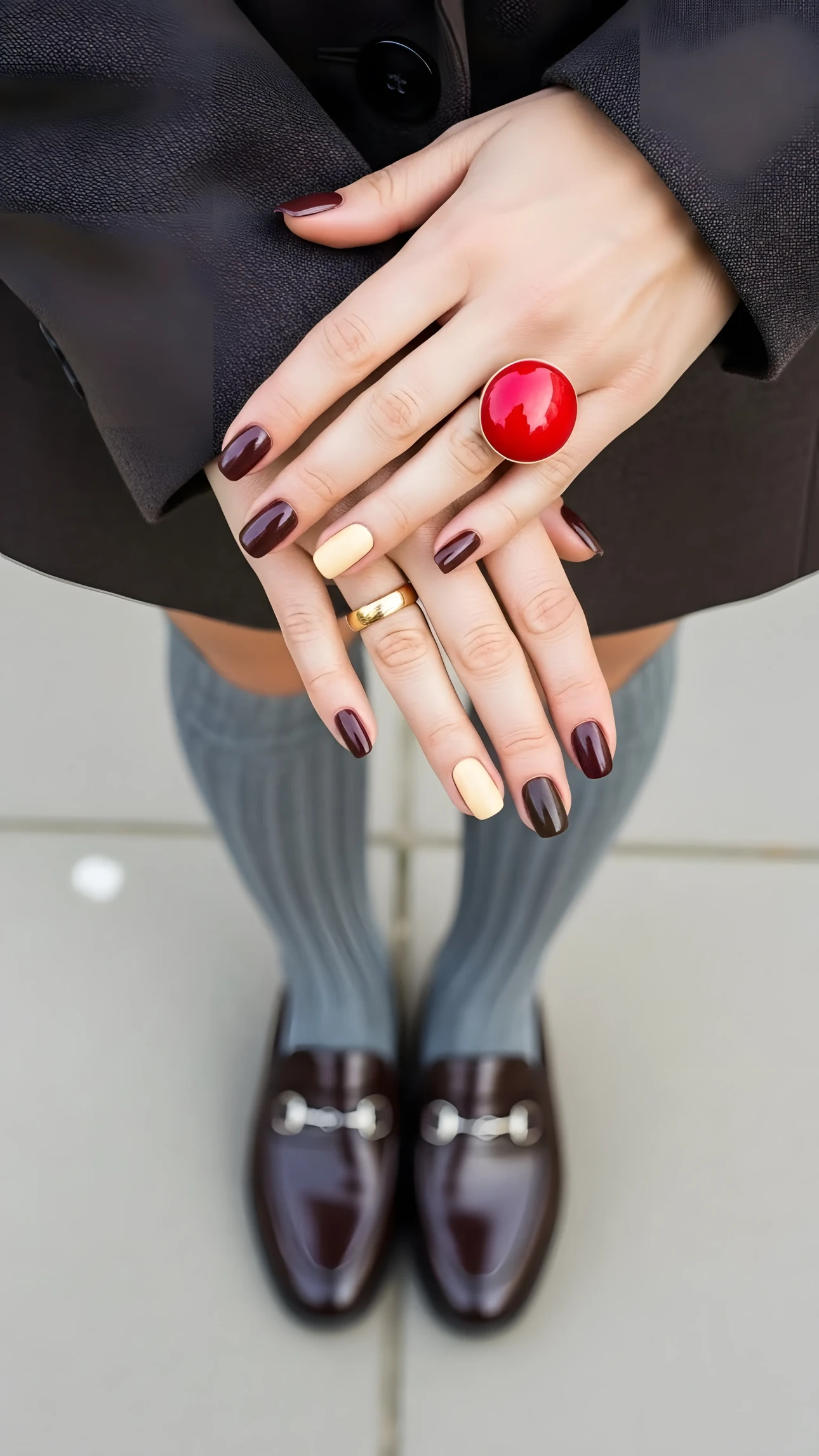 This captivating shot features a woman's hands, adorned with a striking red ring and a meticulously applied two-tone manicure in rich burgundy and soft cream. The hands are gracefully posed, drawing attention to the jewelry and nail artistry. The composition extends to reveal the lower portion of the subject, showcasing classic leather loafers paired with subtly textured grey knee socks, adding a touch of preppy chic. The color palette is carefully curated, balancing the boldness of the red ring and burgundy nails with the understated tones of the cream manicure, grey socks, and dark brown loafers. The lighting is soft and diffused, enhancing the textures and creating a polished, high-fashion aesthetic. The overall mood is one of refined style and attention to detail, making it ideal for projects that require a touch of luxury and sophistication.